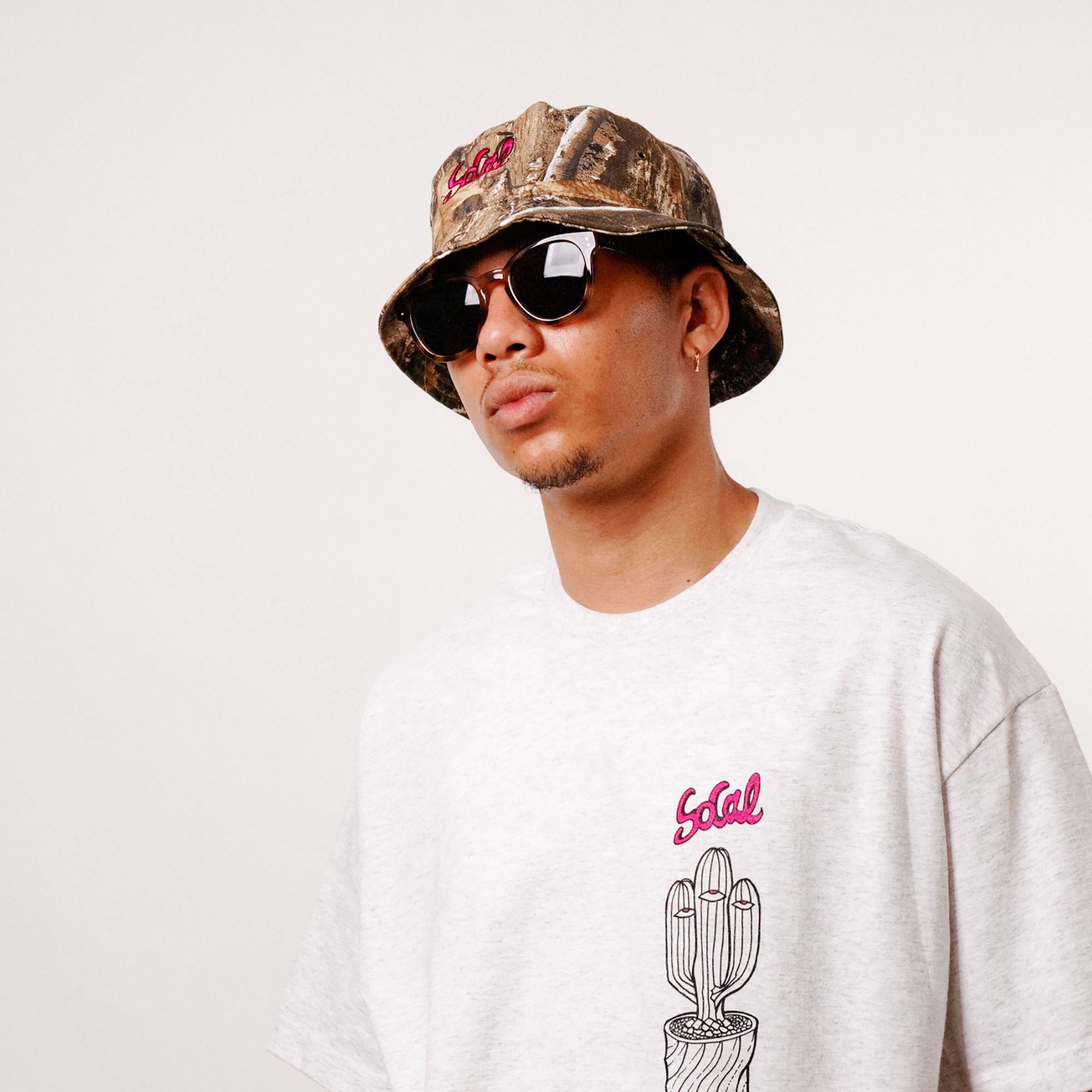 リアルツリーのハードなイメージを、ピンクのロゴで中和したバランスの良いデザインのバケットハット。