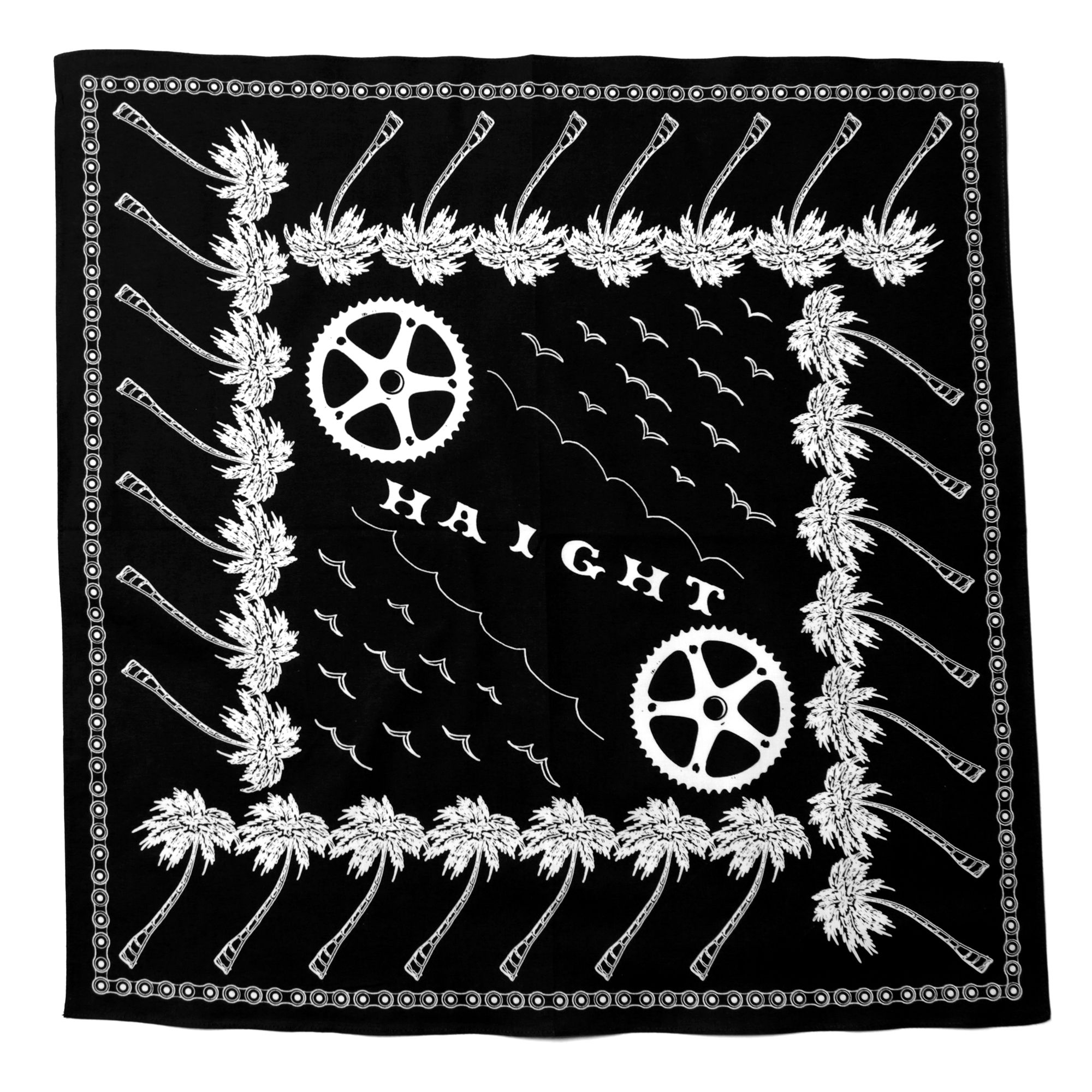 シーチング生地を採用したしっかりとした質感のバンダナ。 西海岸を連想させるパームツリーとカモメ、 さらにチェーンリングと縁を囲うチェーンのデザインは、ヴィンテージクルーザー好きなCHOMESS氏ならでは。カラーは、BLACK/RED/GREENの3色展開になります。